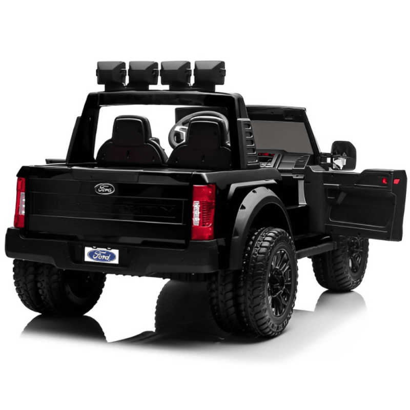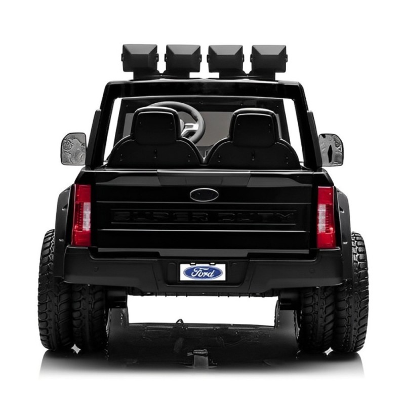 This brand-new, fully upgraded 24V Licensed Ford Super Duty kids car is brought to you by MYTS. This model has a large seat with a capacity for two riders. The Seat is made with soft material and comes with two separate seat belts attached. This model comes with 6 EVA wheels, 2 in the front and 4 in the rear. This model is also 24V with two strong batteries connected in series for more power and speed and a new shape. Which a removable battery box now you can take out the battery and charge it without keeping the entire car parked near the power supply. This car is good for driving on concrete or the grass with two powerful motors. Gearstick for forward and reverse function.